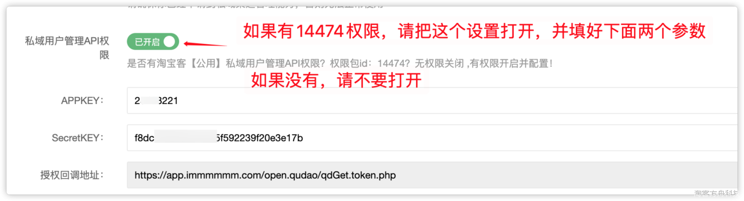 **②填寫"淘寶客私域用戶管理"****權限****申請表時,在對應的選項中填入上面查看到的appkey。**