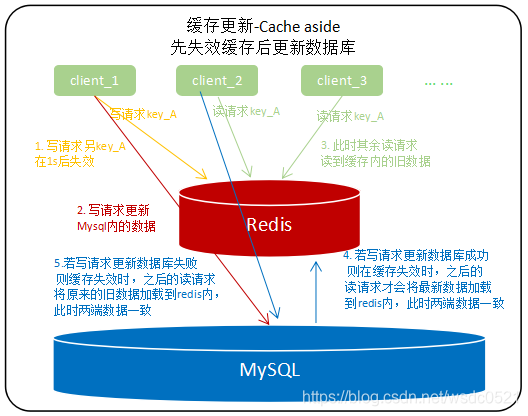* **先失效緩存后更新數據庫**:并發場景下,推薦使用延遲失效(寫請求**開始前**給緩存設置1s過期時間),在寫請求失效緩存時設置一個1s延遲時間,然后再去更新數據庫的數據,此時其他讀請求仍然可以讀到緩存內的數據,當數據庫端更新完成后,緩存內的數據已失效,之后的讀請求會將數據庫端最新的數據加載至緩存內保證緩存和數據庫端數據一致性;在這種方案下,第二步操作異常不會引起數據不一致,例如設置了緩存1s后失效,然后在更新數據庫時報錯,即使緩存失效,之后的讀請求仍然會把更新前的數據重新加載到緩存內。