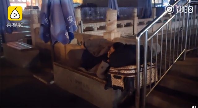 40歲的山東人趙聯濤穿著工作服棉襖,又特意穿了2條毛褲,躺在火車站外面的露天長椅上睡覺。