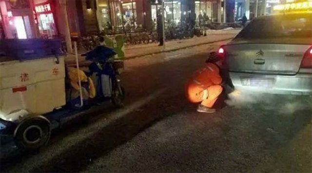 冷得蹲在一輛停在路邊的出租車排氣管口暖手。
