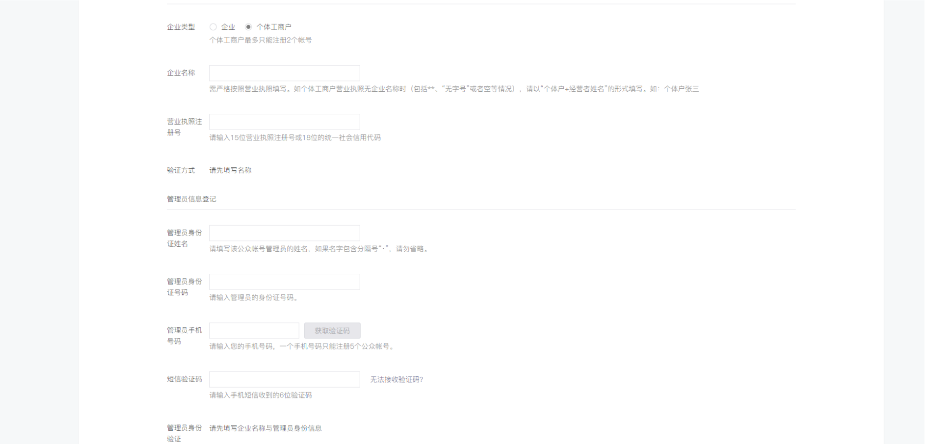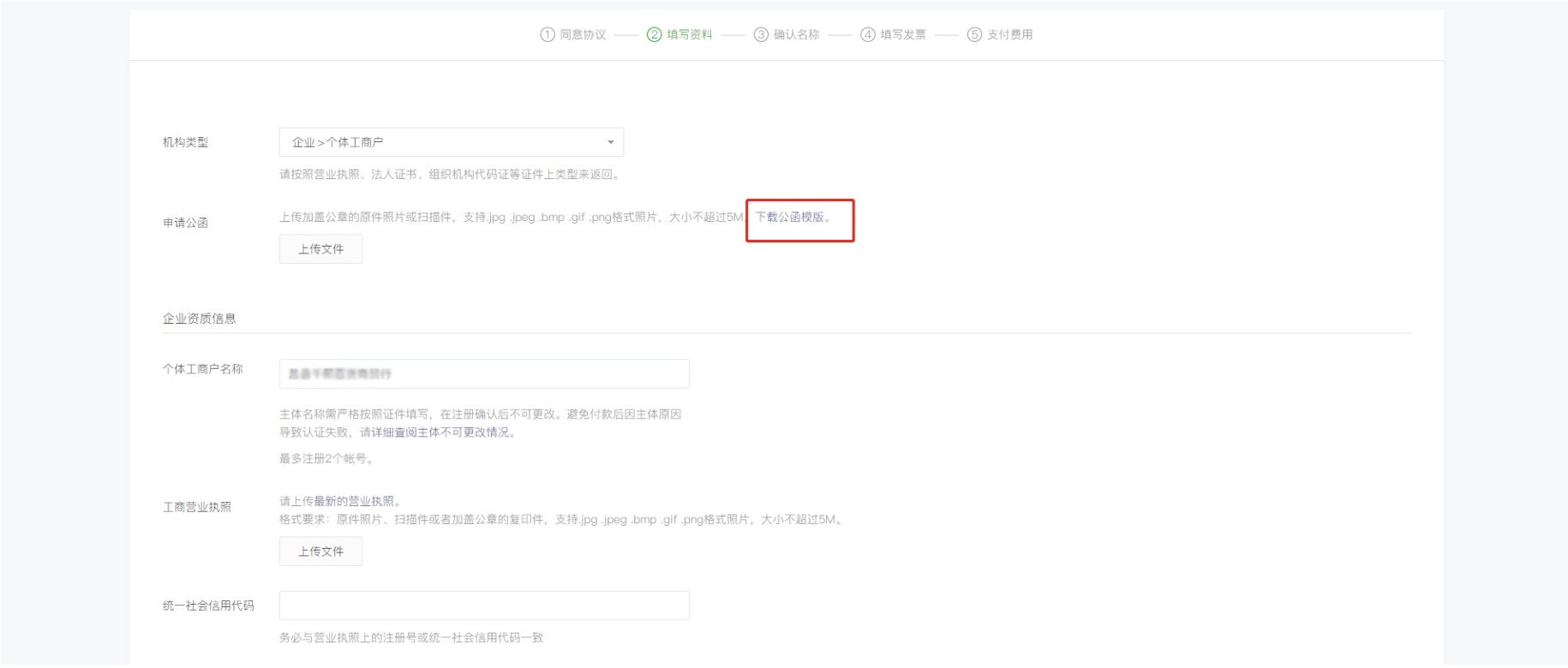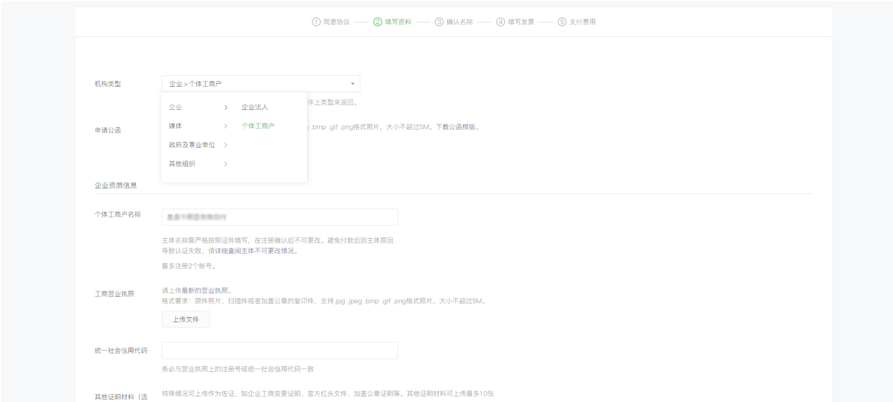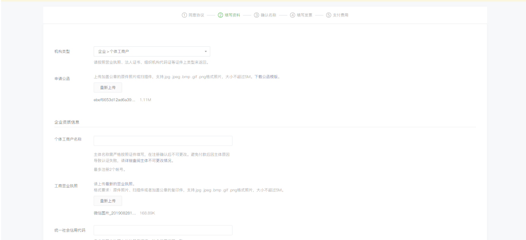 [TOC] # 準備材料 1,兩個郵箱號碼(作為公眾號和小程序的登陸賬號,沒有的話可以注冊網易郵箱) 2,法人身份證 3,營業執照和相關資質文件電子版照片 4,綁定管理員名下銀行卡的微信 5,微信內有300元認證費(騰訊每年會收取300元認證費,先注冊公眾號,關聯同主體小程序,只需要一份認證費) * * * # 申請注冊公眾號 瀏覽器打開網址https://mp.weixin.qq.com,點擊“立即注冊”。 ![](https://img.kancloud.cn/2a/d1/2ad1078a5bc13ff9c549b60271b3202b_1825x497.png) 選擇注冊的帳號類型頁面,點擊選擇“服務號”。 ![](https://img.kancloud.cn/5d/3f/5d3f3c90d4b53f89cd814a56365b5de0_1840x710.png) 填寫郵箱賬號并激活郵箱,設置公眾號登陸密碼(注:不是郵箱密碼,是公眾號登陸密碼) ![](https://img.kancloud.cn/f3/2f/f32f555d8ad27cc340113045184f3778_1796x880.png) 選擇中國大陸,點擊確定 ![](https://img.kancloud.cn/75/2c/752cddcc92a746e5351376865d043483_1864x645.png) 點擊紅框處(千萬別選錯類型,選錯不可更改) ![](https://img.kancloud.cn/87/8a/878a7d62e993de9f35ef8446c88555ce_1839x801.png) 根據企業情況,選擇主體類型 ![](https://img.kancloud.cn/c0/9f/c09f9fa86716b6176b6bada1245c9196_1830x859.png) 填寫企業信息和管理員信息 ![](https://img.kancloud.cn/25/43/2543dfbb86032786cc5180bfc91df1e1_1809x866.png) 編輯公眾號信息 ![](https://img.kancloud.cn/13/f1/13f1709437a8638e91ee0223c4665485_1396x871.png) 下一步就是認證,點擊紅框部位 ![](https://img.kancloud.cn/c4/29/c429f7c1e8431be4a56d5edd65e9398a_1819x846.png) ![](https://img.kancloud.cn/70/78/7078a2348f32be3ef62d26fbfeb70bda_1841x834.png) ![](https://img.kancloud.cn/70/16/70162c387136293f0d7cea93df9ae69b_1813x816.png) 下載公函模板,并打印出紙質文件 ![](https://img.kancloud.cn/d7/3c/d73cd5035e756615308a2908d45bac7e_1830x780.png) ![](https://img.kancloud.cn/4c/b1/4cb1836154e9f198dab38c33833c8525_1791x869.png) 如果沒有打印機,可以點擊保存按鈕,保存到電腦內,拷貝到打印處打印 ![](https://img.kancloud.cn/16/52/165254bb013c9fcb3ace0bf6fa96e02c_1830x848.png) 在打印的公函上填寫管理員姓名和身份證號碼,(注:公司性質需要蓋公章,個體工商戶可以法人簽名。) ![](https://img.kancloud.cn/2a/89/2a89d27e80246d8bc69f8f91bcbe7c81_516x920.png) 清晰拍攝公函完整照片,存入到電腦內并上傳 ![](https://img.kancloud.cn/e2/bf/e2bf6a275db4739dd394adc66a6f9a79_1847x744.png) 根據要求填寫企業資質信息 ![](https://img.kancloud.cn/77/27/7727f8cb4f776de60c2afdbdf64b934e_1835x837.png) 用綁定法人銀行卡的微信掃碼 ![](https://img.kancloud.cn/8f/2a/8f2ac733bdbca7c21669424165f79fd6_1839x795.png) 填寫申請認證昵稱(公眾號名稱) ![](https://img.kancloud.cn/9a/60/9a601bbc5919817d195d60304578702e_1843x756.png) 根據實際要求選擇是否需要發票 ![](https://img.kancloud.cn/2e/7c/2e7c4a57a06da30cc7cc882515f21ff5_1847x835.png) ![](https://img.kancloud.cn/87/df/87df5104faef894d306b3b0ea6dedadb_1836x832.png) 掃碼支付300元認證費 ![](https://img.kancloud.cn/b5/8a/b58a94e71c2a24b5ed1e3a5e1ace095c_1837x720.png) 等待審核通過即可(期間會有工作人員電話認證,需要如實回答) ![](https://img.kancloud.cn/dc/82/dc82b676c8dfa8a4729d9e7e1de940ef_1840x600.png) # 注冊小程序 認證成功后,登陸微信公眾平臺,點擊小程序管理,選擇點擊紅框處 ![](https://img.kancloud.cn/cf/5b/cf5b6b68e5fe161d71d839fcf1b07502_1843x691.png) 用管理員微信掃描二維碼 ![](https://img.kancloud.cn/3b/2d/3b2d68654237c2e6d3e2f078f01de158_1847x709.png) 全部勾選,點擊下一步 ![](https://img.kancloud.cn/a5/2a/a52ae6c64680afceb028dc5d491c0d2c_1822x672.png) 輸入另一個準備好的郵箱號碼,填寫小程序密碼等信息 ![](https://img.kancloud.cn/bf/37/bf37fd874748a66d9ad4cdde1c37b5f1_1837x780.png) 進入郵箱激活小程序 ![](https://img.kancloud.cn/36/a5/36a5fb4013c446180b070f7b6b221e08_1844x719.png) 設置小程序管理員 ![](https://img.kancloud.cn/22/09/22098148bc07c2ff04852313ce55e047_1841x801.png) 編輯小程序名稱和頭像等信息 ![](https://img.kancloud.cn/71/a9/71a98168683750e10a4bf27be770bbed_1843x686.png) ![](https://img.kancloud.cn/8f/32/8f3274e4aaec48146b86ffa47ea22d4c_1674x862.png)