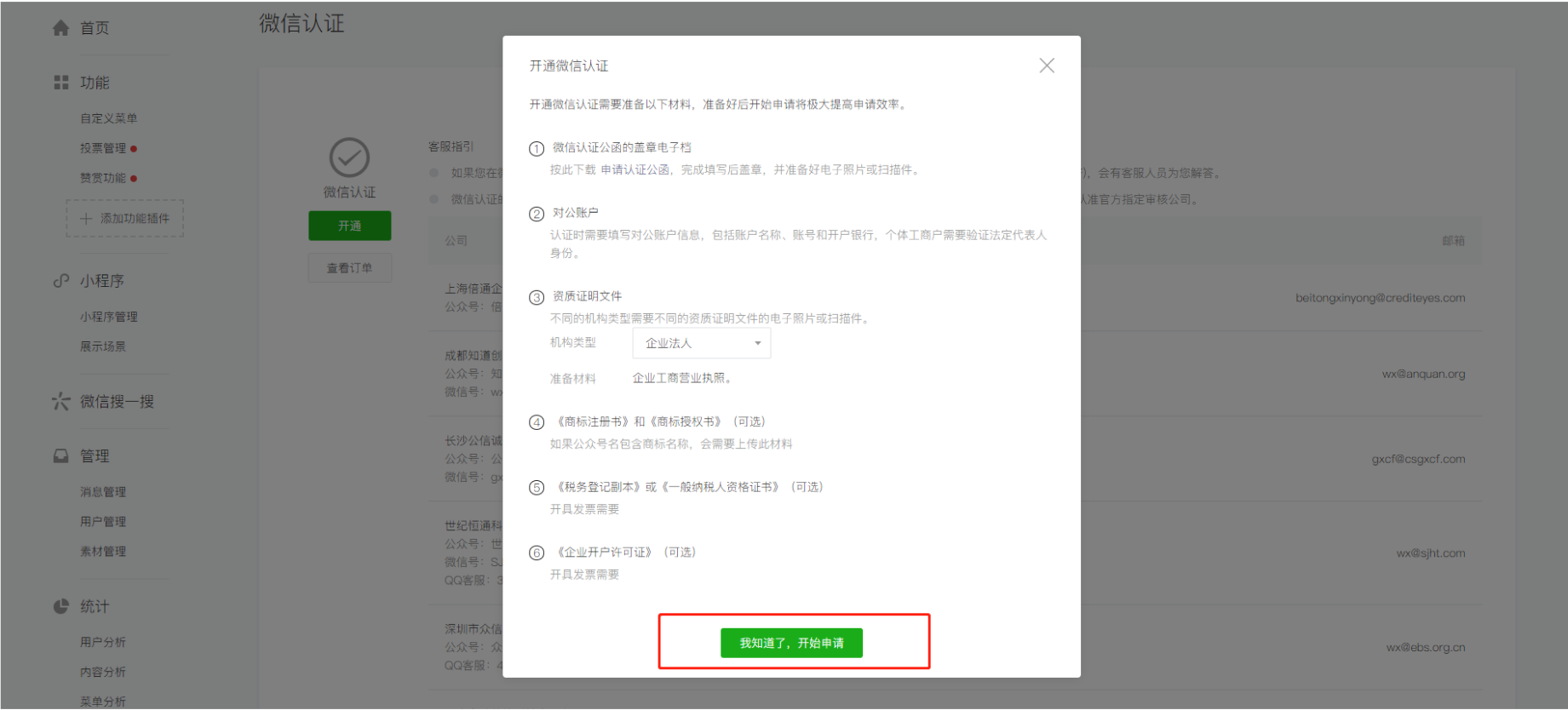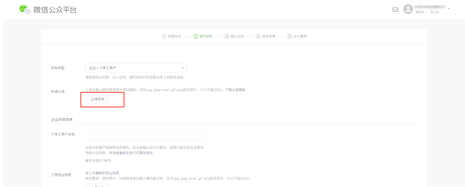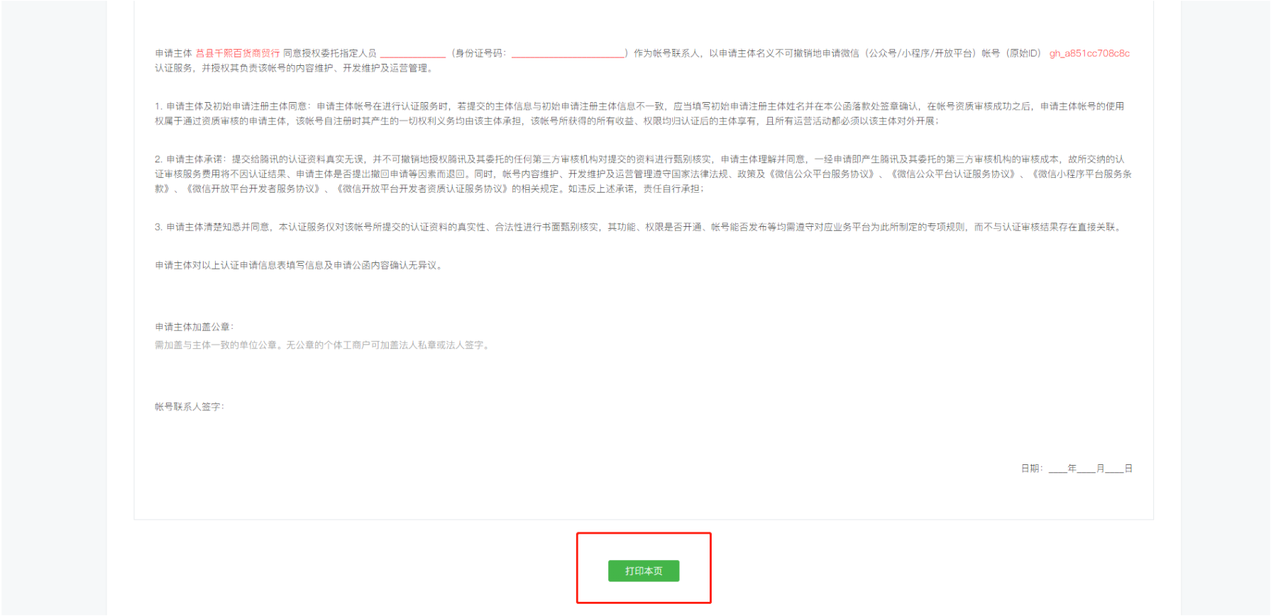 [TOC] # 準備材料 1,兩個郵箱號碼(作為公眾號和小程序的登陸賬號,沒有的話可以注冊網易郵箱) 2,法人身份證 3,營業執照和相關資質文件電子版照片 4,綁定管理員名下銀行卡的微信 5,微信內有300元認證費(騰訊每年會收取300元認證費,先注冊公眾號,關聯同主體小程序,只需要一份認證費) * * * # 申請注冊公眾號 瀏覽器打開網址https://mp.weixin.qq.com,點擊“立即注冊”。 ![](https://img.kancloud.cn/2a/d1/2ad1078a5bc13ff9c549b60271b3202b_1825x497.png) 選擇注冊的帳號類型頁面,點擊選擇“服務號”。 ![](https://img.kancloud.cn/5d/3f/5d3f3c90d4b53f89cd814a56365b5de0_1840x710.png) 填寫郵箱賬號并激活郵箱,設置公眾號登陸密碼(注:不是郵箱密碼,是公眾號登陸密碼) ![](https://img.kancloud.cn/f3/2f/f32f555d8ad27cc340113045184f3778_1796x880.png) 選擇中國大陸,點擊確定 ![](https://img.kancloud.cn/75/2c/752cddcc92a746e5351376865d043483_1864x645.png) 點擊紅框處(千萬別選錯類型,選錯不可更改) ![](https://img.kancloud.cn/87/8a/878a7d62e993de9f35ef8446c88555ce_1839x801.png) 根據企業情況,選擇主體類型 ![](https://img.kancloud.cn/c0/9f/c09f9fa86716b6176b6bada1245c9196_1830x859.png) 填寫企業信息和管理員信息 ![](https://img.kancloud.cn/25/43/2543dfbb86032786cc5180bfc91df1e1_1809x866.png) 編輯公眾號信息 ![](https://img.kancloud.cn/13/f1/13f1709437a8638e91ee0223c4665485_1396x871.png) 下一步就是認證,點擊紅框部位 ![](https://img.kancloud.cn/c4/29/c429f7c1e8431be4a56d5edd65e9398a_1819x846.png) ![](https://img.kancloud.cn/70/78/7078a2348f32be3ef62d26fbfeb70bda_1841x834.png) ![](https://img.kancloud.cn/70/16/70162c387136293f0d7cea93df9ae69b_1813x816.png) 下載公函模板,并打印出紙質文件 ![](https://img.kancloud.cn/d7/3c/d73cd5035e756615308a2908d45bac7e_1830x780.png) ![](https://img.kancloud.cn/4c/b1/4cb1836154e9f198dab38c33833c8525_1791x869.png) 如果沒有打印機,可以點擊保存按鈕,保存到電腦內,拷貝到打印處打印 ![](https://img.kancloud.cn/16/52/165254bb013c9fcb3ace0bf6fa96e02c_1830x848.png) 在打印的公函上填寫管理員姓名和身份證號碼,(注:公司性質需要蓋公章,個體工商戶可以法人簽名。) ![](https://img.kancloud.cn/2a/89/2a89d27e80246d8bc69f8f91bcbe7c81_516x920.png) 清晰拍攝公函完整照片,存入到電腦內并上傳 ![](https://img.kancloud.cn/e2/bf/e2bf6a275db4739dd394adc66a6f9a79_1847x744.png) 根據要求填寫企業資質信息 ![](https://img.kancloud.cn/77/27/7727f8cb4f776de60c2afdbdf64b934e_1835x837.png) 用綁定法人銀行卡的微信掃碼 ![](https://img.kancloud.cn/8f/2a/8f2ac733bdbca7c21669424165f79fd6_1839x795.png) 填寫申請認證昵稱(公眾號名稱) ![](https://img.kancloud.cn/9a/60/9a601bbc5919817d195d60304578702e_1843x756.png) 根據實際要求選擇是否需要發票 ![](https://img.kancloud.cn/2e/7c/2e7c4a57a06da30cc7cc882515f21ff5_1847x835.png) ![](https://img.kancloud.cn/87/df/87df5104faef894d306b3b0ea6dedadb_1836x832.png) 掃碼支付300元認證費 ![](https://img.kancloud.cn/b5/8a/b58a94e71c2a24b5ed1e3a5e1ace095c_1837x720.png) 等待審核通過即可(期間會有工作人員電話認證,需要如實回答) ![](https://img.kancloud.cn/dc/82/dc82b676c8dfa8a4729d9e7e1de940ef_1840x600.png) # 注冊小程序 認證成功后,登陸微信公眾平臺,點擊小程序管理,選擇點擊紅框處 ![](https://img.kancloud.cn/cf/5b/cf5b6b68e5fe161d71d839fcf1b07502_1843x691.png) 用管理員微信掃描二維碼 ![](https://img.kancloud.cn/3b/2d/3b2d68654237c2e6d3e2f078f01de158_1847x709.png) 全部勾選,點擊下一步 ![](https://img.kancloud.cn/a5/2a/a52ae6c64680afceb028dc5d491c0d2c_1822x672.png) 輸入另一個準備好的郵箱號碼,填寫小程序密碼等信息 ![](https://img.kancloud.cn/bf/37/bf37fd874748a66d9ad4cdde1c37b5f1_1837x780.png) 進入郵箱激活小程序 ![](https://img.kancloud.cn/36/a5/36a5fb4013c446180b070f7b6b221e08_1844x719.png) 設置小程序管理員 ![](https://img.kancloud.cn/22/09/22098148bc07c2ff04852313ce55e047_1841x801.png) 編輯小程序名稱和頭像等信息 ![](https://img.kancloud.cn/71/a9/71a98168683750e10a4bf27be770bbed_1843x686.png) ![](https://img.kancloud.cn/8f/32/8f3274e4aaec48146b86ffa47ea22d4c_1674x862.png)