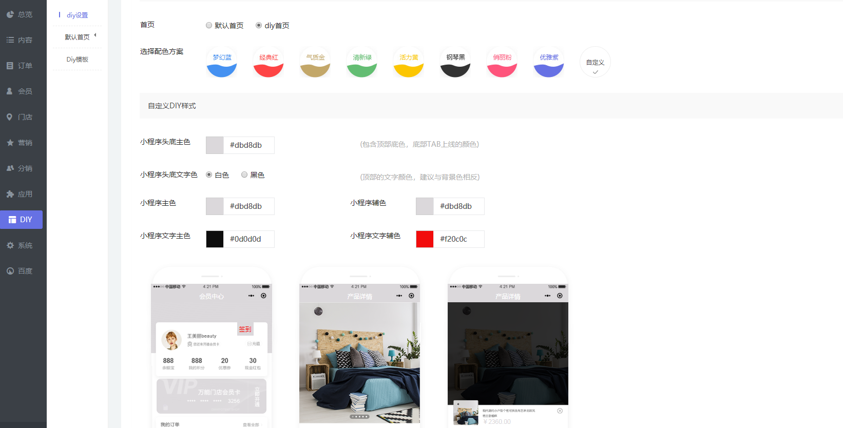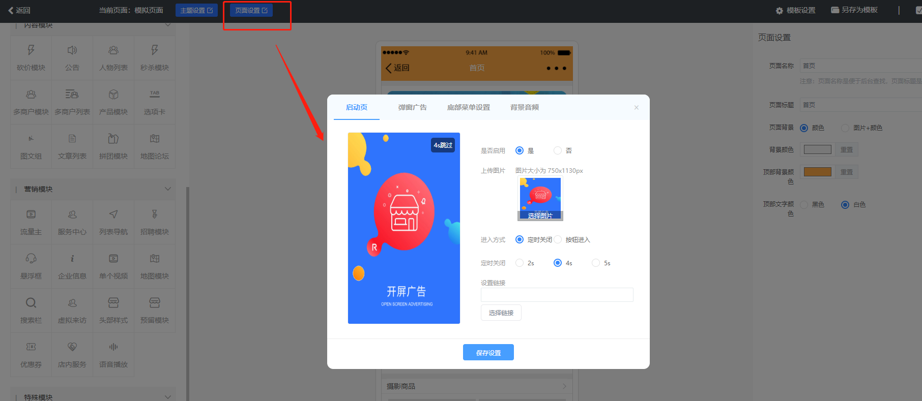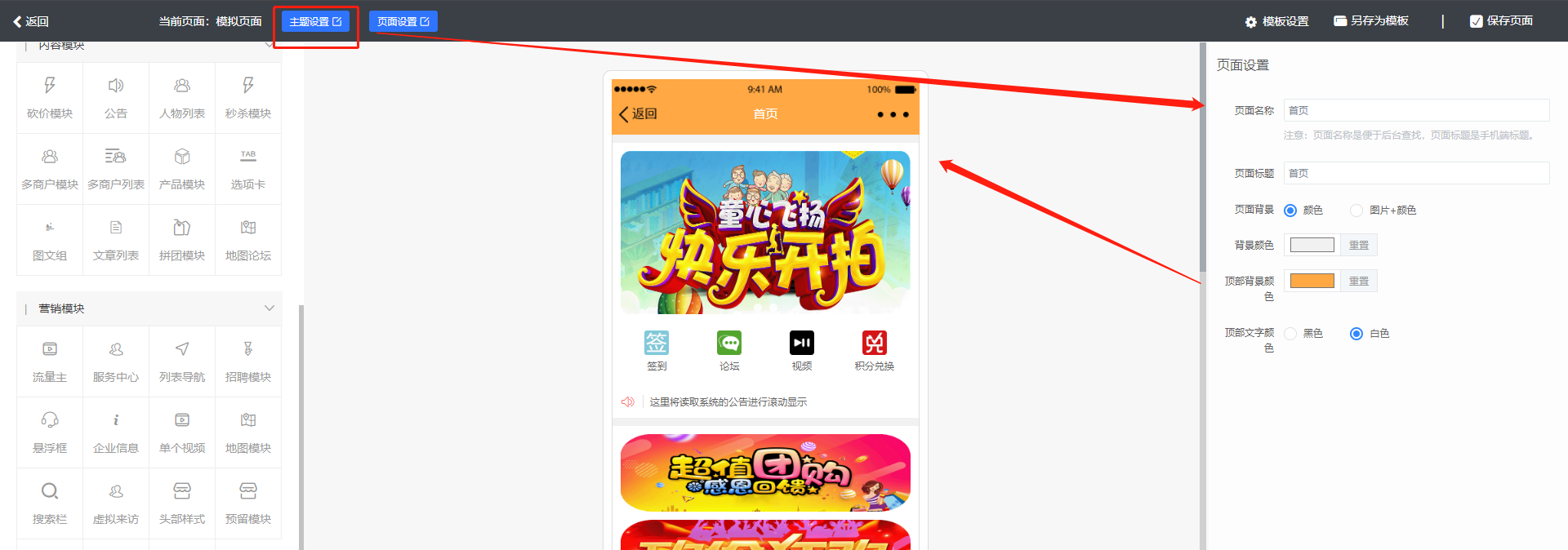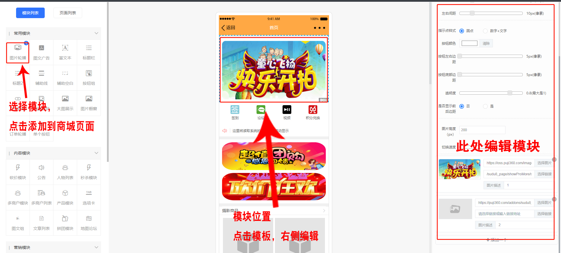 左側選擇模板并點擊添加到中間商城頁面,點擊商城頁面剛添加的模塊,在右側編輯